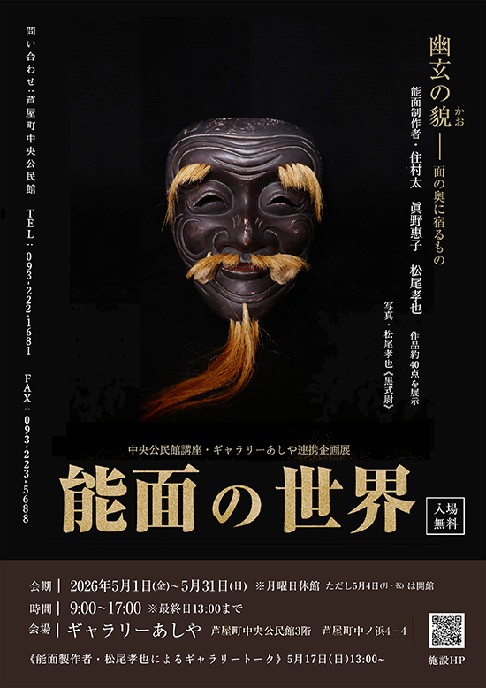 能面制作者・住村太さん、眞野惠子さん、松尾孝也さんの作品を展示します。